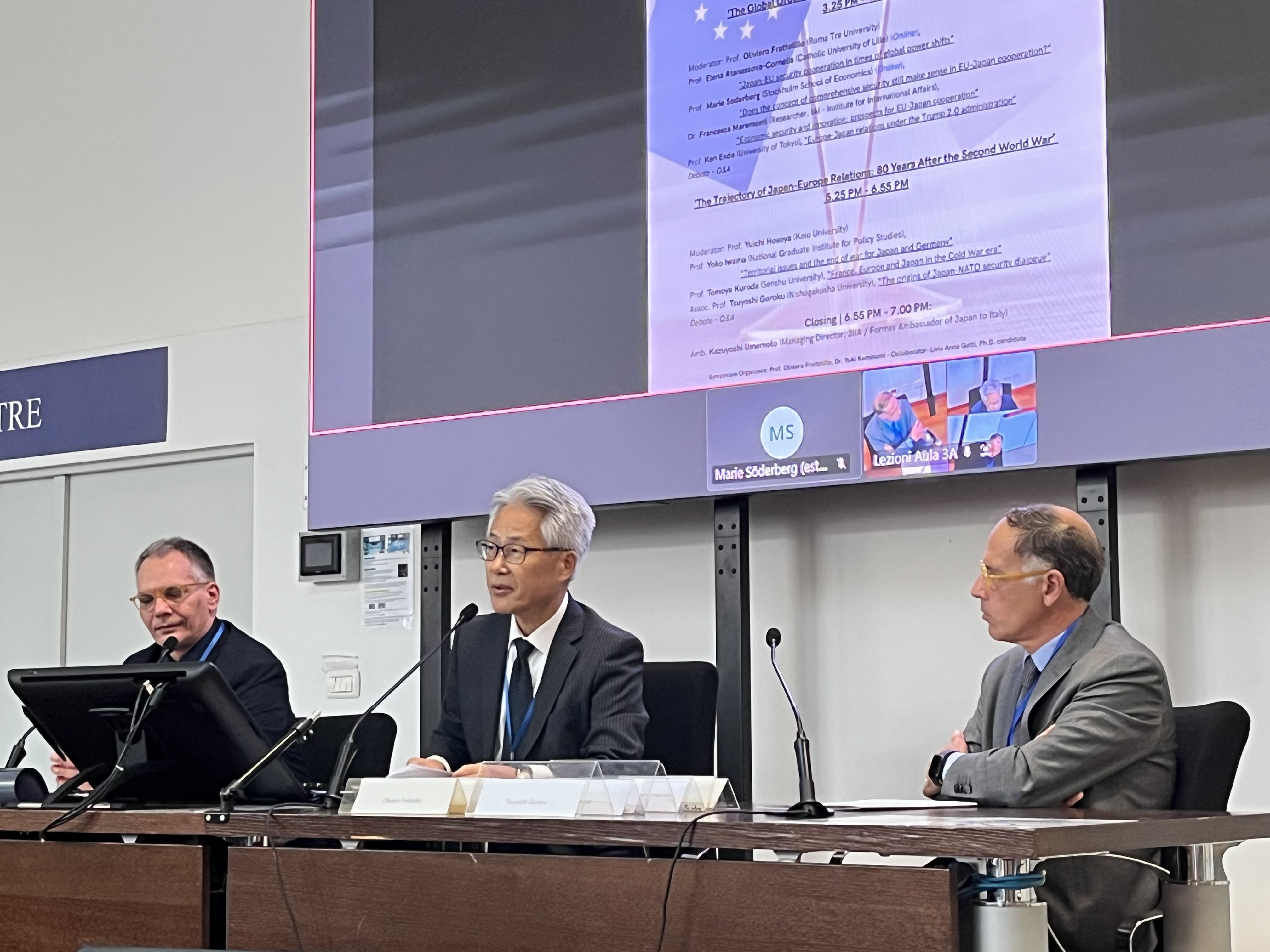 2025年11月5日にローマ第3大学(Roma Tre University)との共催で、国際シンポジウム「日欧協力の80年(80 Years of Japan-Europe Cooperation)」をイタリア・ローマ市内で開催しました。約200名のオーディエンスが会場に詰めかけるなか、日欧の専門家が日欧関係の軌跡と展望を議論しました。開会にあたって、鈴木哲・駐イタリア日本国大使からもご挨拶をいただきました。
