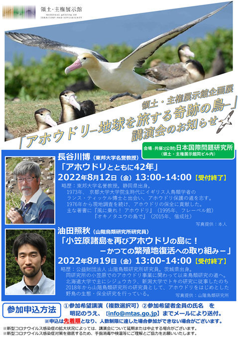 | 第2回講演会 ・開催日:2022年8月19日13:00~14:00 ・講師:油田照秋(山階鳥類研究所 研究員) ・「小笠原諸島を再びアホウドリの島に!-かつての繁殖地復活への取り組みー」 |