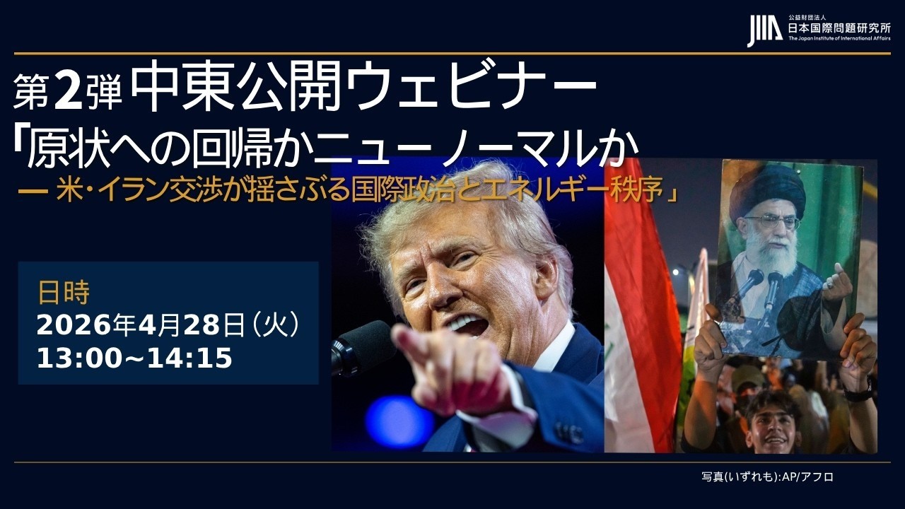 中東情勢をめぐる緊張の高まりは、ホルムズ海峡を含む地域全体を世界経済・安全保障のリスクの震源へと押し上げています。軍事行動の発生直後の情勢を分析した第1回ウェビナーに多くの反響をいただいたことを受け、このたび第2回を開催いたしました。本回のウェビナーでは、実施当日までの最新の状況をみながら、1) 米国、イラン及びイスラエルのそれぞれの狙い、2) 和平交渉と今後のエネルギー市場と国際経済への影響、3) グローバルな安全保障環境の変貌、などの諸論点を整理し、日本を含む各国の選択肢を議論しました。