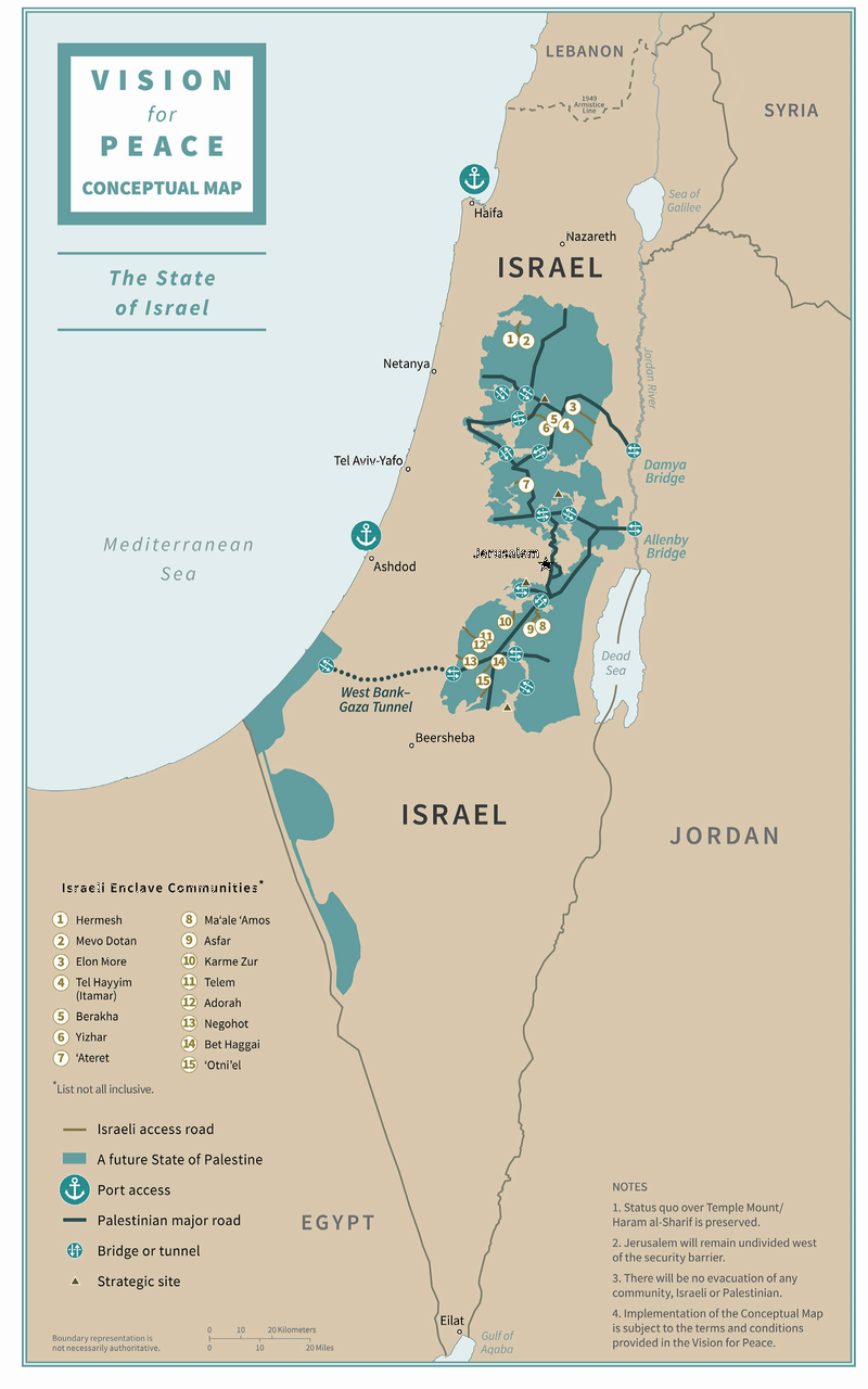 - 西岸の約30%(ヨルダン渓谷、死海沿岸、全入植地)をイスラエルが併合。