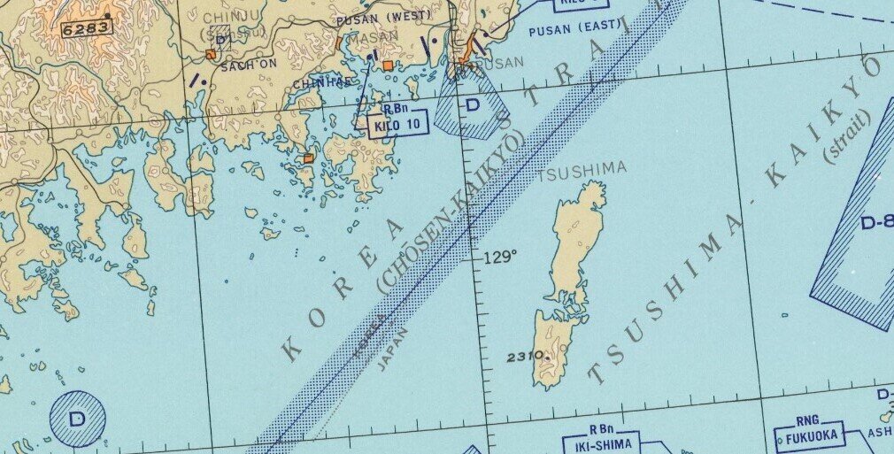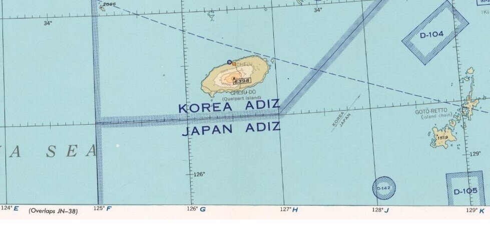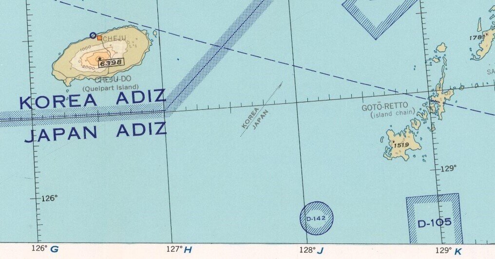 1954年の航空図USAF JET NAVIGATION CHART,JN-25,YELLOW SEA,1st EDITIONによると、済州島南部では、北緯33度線でKOERA ADIZとJAPAN ADIZの境界線が引かれており、ソコトラ岩は、日本側の防空識別圏に入っている【図1】。2013年12月、韓国政府は韓国・済州島南部の空域を韓国防空識別圏(KADIZ)に含むように設定したが、それまでは、ソコトラ岩上空を飛行する際、日本側にこれを通報しなければならなかったとされる3。そもそも暗礁は国際法上、領土とはならないものの、防空識別圏が、島嶼の領有権の根拠となるのであれば、ソコトラ岩は日本領ということになる。