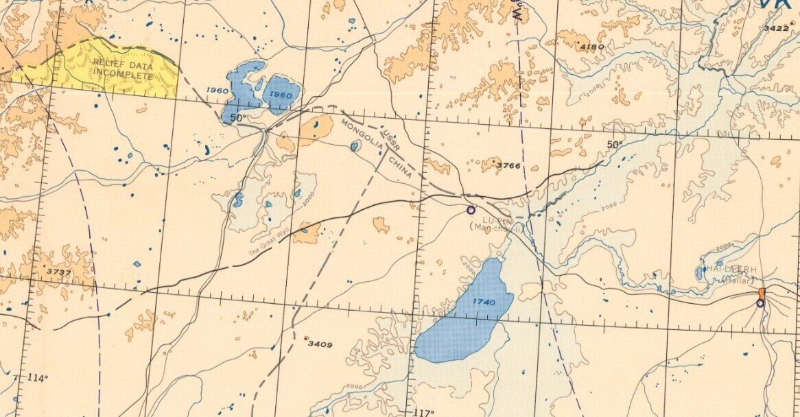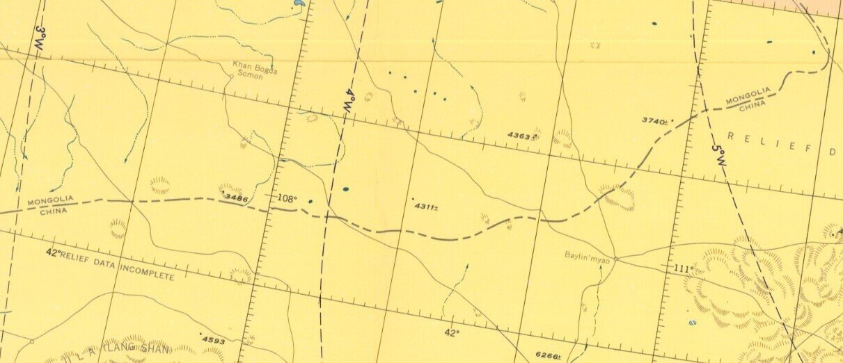 1954年の航空図USAF JET NAVIGATION CHART,JN-25,YELLOW SEA,1st EDITIONでは、凡例にある灰色の二点鎖線が、'International Boundaries'(国境線)を指している。主にこの国境線は陸域に記されている。この国境線は、CHINA(中国)、MONGOLIA(モンゴル)、USSR(ソ連)、KOREA(朝鮮、韓国)の国境にみられる。このうち、モンゴルの北側のモンゴルとソ連の国境【図10】、モンゴルに東側のモンゴルと中国とソ連の国境(中国・内モンゴル自治区の満州里(航空図ではLU-PIN(Man-chou-li)と記載)付近)【図11】、モンゴル南部のモンゴルと中国の国境【図12】は明確に国境線が引かれている。