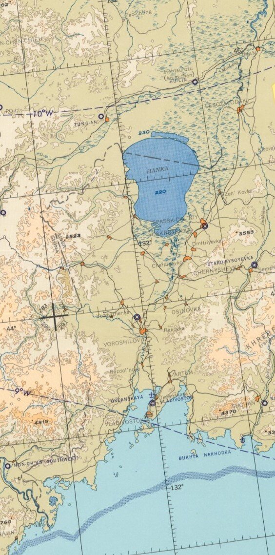 しかしながら、中国・ソ連の国境については、満州里から北東のアルグン川沿いの北緯50度付近は国境線が途切れている【図11】。また、中国東北部の中国・ソ連の国境は、アムール川、ウスリー川となっているが、ハバロフスク(KHABAROVSK)西部のアムール川沿いの周辺の国境線に、USSRとCHINAの表記はあるものの、アムール川、ウスリー川とも国境線の記載は途切れ途切れとなっている【図13】。アムール川、ウスリー川、アルグン川の地域は長らく中ソ間で国境紛争が起きた地域である。さらに、朝鮮・韓国の国境に近い、ソ連のウラジオストク北方のヴォロシロフ(VOROSHILOV、1957年ウスリースクに改称)西部の中国・ソ連の国境線も途切れている【図14】。