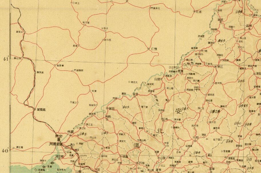 また、中国と韓国・朝鮮の国境については、おおむね東部は豆満江沿い、西部・中部は鴨江沿いに国境線があるものの、東部では、中国の琿春(HUN-CHUN)の西側、中国の図們(TUMEN)の南側、9003フィート(2744m)と記す、中朝国境の白頭山の南から朝鮮の恵山鎮(HYESANJIN)までの間、朝鮮の恵山鎮から中国・臨江(航空図に地名表記なし。○印のTown and Villageの表記あり)までの間では国境線が途切れている【図15】。さらに、中国・臨江から朝鮮の慈城(いずれも航空図に地名表記なし。○印あり)付近(鴨緑江の慈城口の南に位置する朝鮮の雲峰洞付近)までの間、朝鮮の慈城付近から朝鮮の江界(KANGGYE(KOKAI))の西の渭原(航空図に地名記載なし。○印なし)付近までの間、朝鮮の渭原付近から中朝国境の水豊ダム(Sui Ho Reservoir)付近までの間、そして、中朝国境の水豊ダム付近から鴨緑江河口の朝鮮の新義州(SINUIJU)の南に位置する薪島(航空図に地名表記なし)付近までの間には、国境線が途切れている。一方、朝鮮恵山鎮の西側、そして、朝鮮の薪島から海に向けては、国境線が引かれ、CHINA及びKOREAの表記がみられる【図16】。要するに、この航空図には、陸地の国境も国境線が途切れているところがあるのである。ちなみに、時代はさかのぼるものの、朝鮮総督府、1920(大正9)年発行、1924(大正13)年修正発行の「朝鮮百五十万分一図」は、朝鮮総督府による地形測量に基づいた5万分1地形図などの地形図をもとにして作製された小縮尺地図の一つで、朝鮮全土を1枚に収録するのを目的とした地図であるが、この地図においても、中朝国境の国境線は途切れ途切れとなっている【図17、図18】。つまり、韓国空軍関係者の主張「国境を区分したものであれば明確でなければならず、座標を表記し、切れた部分があってはならない」は、この航空図についてはそもそも間違っていることが確認できる。