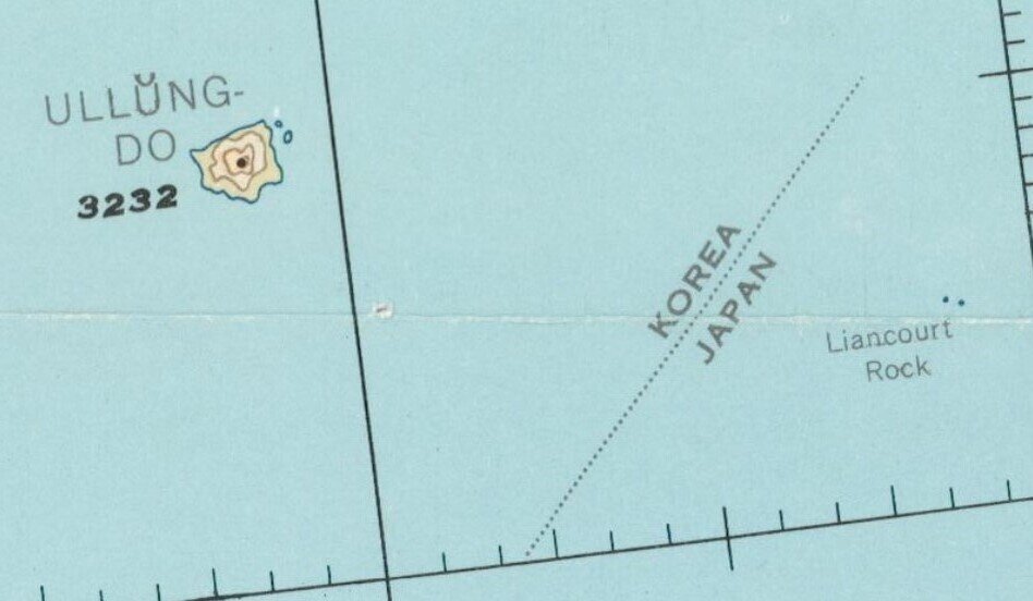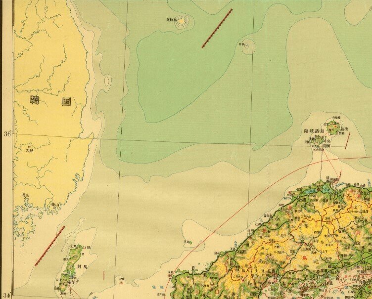 なお、余談であるが、この点線について、凡例に「島嶼の主権」、「陸域のみ」と丁寧に記しているのは、該当の点線の海域が、厳密な国境線の位置ではないことを示している。国際法上、当時の領海は3海里(約5.6km)であり、現在の排他的経済水域(EEZ)200海里(約370.4km)の概念はなかった。鬱陵島と竹島との間の距離は、約87kmである。鬱陵島と竹島の周辺3海里に当時領海は設定できるものの、領海より外側は公海であった。したがって、この海域では国境線を引くことができなかった。したがって、この点線は、あくまで鬱陵島と竹島の島嶼の主権を示したものであり、海域の主権、範囲ではなく、島嶼の陸域の主権のみを示したものである。