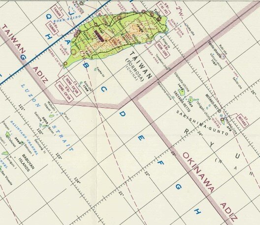 さらに、1954年4月のUSAF NAVIGATIONAL FLIGHT CHART,NF-15,MANILA, PHILIPINES TO TOKYO,JAPAN,3rd EDITION Revised(縮尺50万分1)によれば、沖縄県先島諸島の与那国島東部に、TAIWAN ADIZとOKINAWA ADIZ4の境界線が引かれている【図2、図3】。当時与那国島を含めた沖縄県は、1952年4月発効のサンフランシスコ平和条約により米国の管轄下にあったが、与那国島の西部が、台湾(中華民国)の管轄下にあったことはない。すなわち、防空識別圏と領土、領空とは何ら関係がないことが分かる。したがって、防空識別圏についての韓国・聯合ニュースの報道のうち、「航空識別区域の範囲は、領土とレーダーの探知能力などに基づいて設定されるという点で、独島が韓国の領土という根拠になり得る」は明確に間違いであり、10月23日の報道発表は「ごり押し(こじつけ)」、「妄言」ではないといえる。