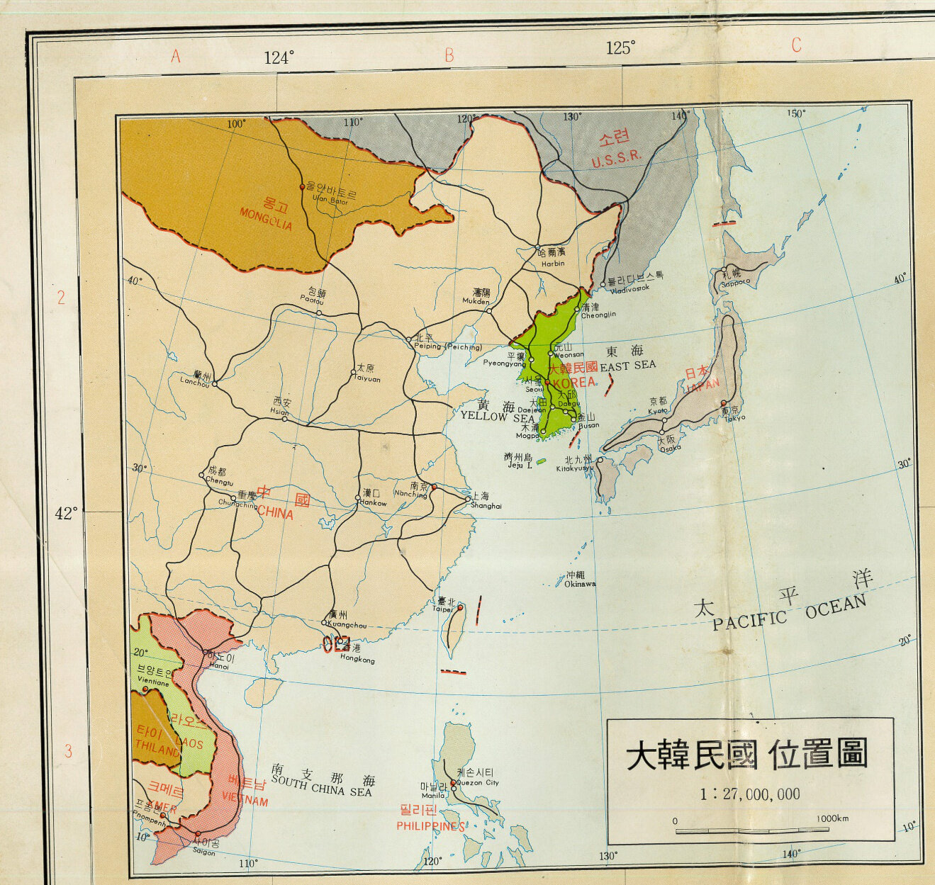 これと同様に、韓国では、博捜したわけではないが、韓国政府の文教部が1972年に編集発行した『大韓民国全図』は、北朝鮮も含めた朝鮮半島全体を大韓民国の領域として記し、2700万分1の「大韓民国位置図」では、海上に引かれた国境線として、わが国の政府見解とは反する記載であるものの、わが国と韓国との間では、東海(日本海)の独島(竹島)の東側、そして釜山と対馬の間のほか、先島諸島と台湾の間、台湾の南側、南樺太と北海道との間に引かれている【図20】。