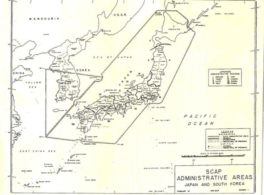 そもそも戦後わが国は陸域での国境はなく、すべて海域での国境であることに留意する必要がある。博捜したわけではないが、わが国を記した地図で、国境線が切れた部分がなく、わが国を取り囲むように、わが国の領域を線で記した地図としては、日本と韓国の暫定的な行政区域を示した、1946年1月連合国軍最高司令官が出した指令SCAPIN677号の地図【図21】、1951年4月7日の「英国外務省対日平和条約一次草案の添付地図」5にみられる。いずれの地図も、竹島を韓国側に入れていることが注目される。しかしながら、一般的な地図には、そうした記載はみられない。一般的には、半島、島嶼の間に国境線を入れることがほとんどである。また、SCAPIN677号については、その第6項には「この指令中の条項は何れも、ポツダム宣言の第8条にある小島嶼の最終的決定に関する連合国側の政策を示すものと解釈してはならない」とし、この指令は暫定的なものであり、領土の決定は平和条約で決定されることが示唆される6。