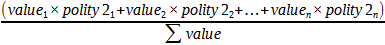 ここでvaluenは各ドナーが中東・北アフリカ諸国に提供した当該年の援助額である。polity2nはドナーの当該年のPolity2スコアである。 は全てのドナーが当該年に支払った援助額の合計である。この式が示すように、Polity2スコアが高い(つまり民主主義の程度が高い)国から多額の援助が提供され、それがPolity2スコアの低い(つまり権威主義的傾向が顕著な)国から提供された援助額を上回れば、中東・北アフリカ諸国の受け取る援助の民主主義的傾向は強くなる。また、逆も同様に想定できる。