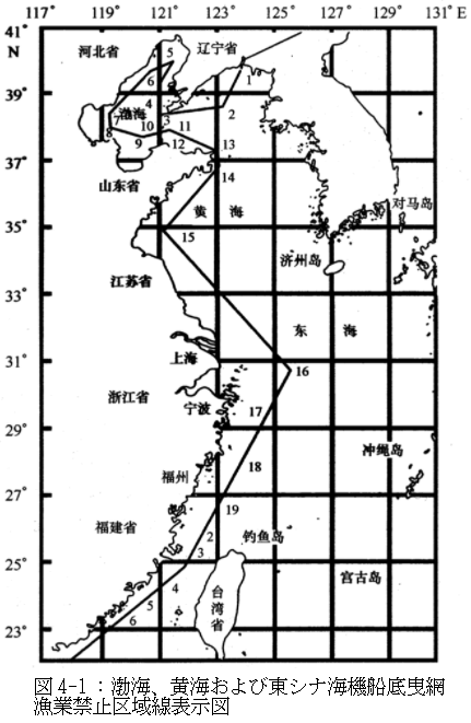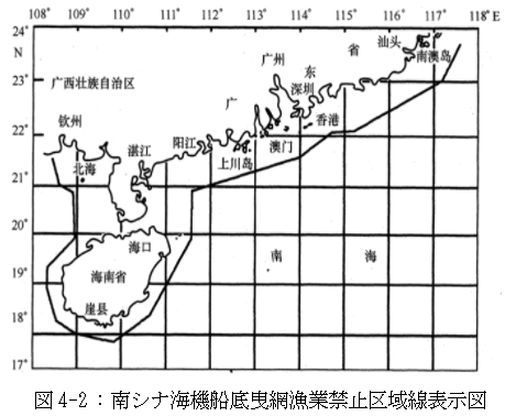 3点目として、漁船の操業・管理形態にも大きな変更があった。それまで漁船の操業ライセンスは地方政府の管理下にあった。しかしこれ以降、1955年に渤海・黄海・東シナ海に、1980年に南シナ海に設置された機船底曳網漁業禁止区域線(機輪拖網禁漁区線)を境界線として、その内側では小型船が、外側では大中型船が操業することになった(図4-1、4-2)2。さらに、小型船は地方政府に、大中型船は北京の農業部に操業を申請することになり、行政管理主体も変更された。この措置は実質的に、係争海域における操業漁船数を減らし、残った少数の大中型船の管理を中央に委ねる効果があった。加えて船舶の登録や操業内容に関するランセンス管理も厳格化された。