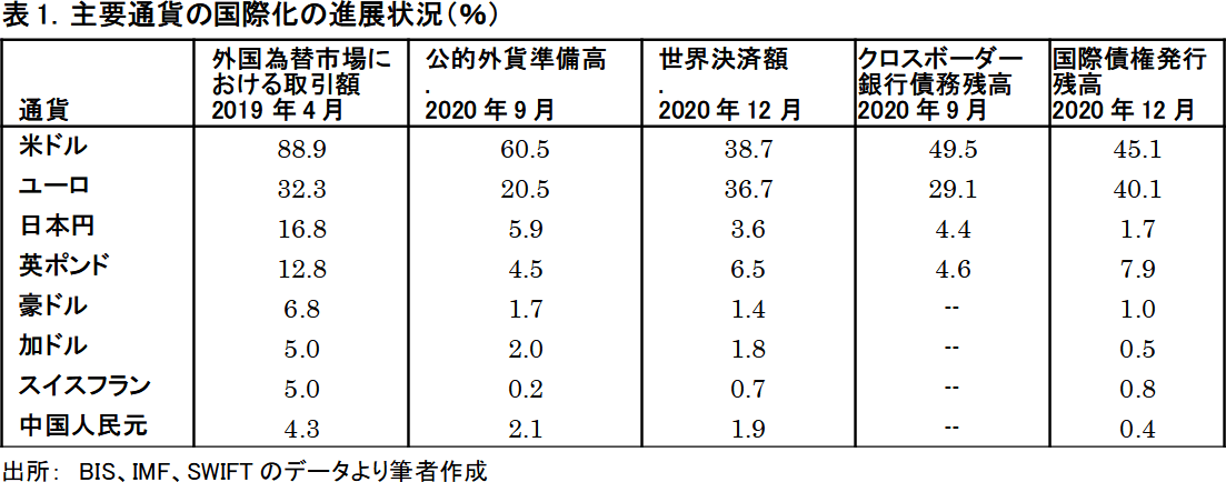 世界の通貨システムは依然として米ドルを中心に機能しているが、近年は中国経済の急速な拡大とともに人民元の国際化が進展している。人民元は貿易・資本取引や公的外貨資産として国際的に使用されるようになり、SDRバスケットの構成通貨にもなっている。また、中国人民銀行(中央銀行)はデジタル人民元の開発に取組み、人民元国際決済システムCIPSを導入し、人民元を主要な国際通貨に押し上げようとしている。その意味で、中国は米国の通貨・金融覇権に対する競争に乗り出しているといえる。