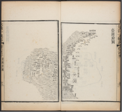 『大清一統志』の「台湾府図」は、その台湾の西側半分が描かれた『皇輿全覧図』を基図として、『台湾府志』に記載された「封域志」の地名を写し、台湾府の疆域を表示していたのである。これと同じ方式は、『大清一統志』の前に編修された『欽定古今図書集成』(1725年完成)の「台湾府疆域図」でも採られた。