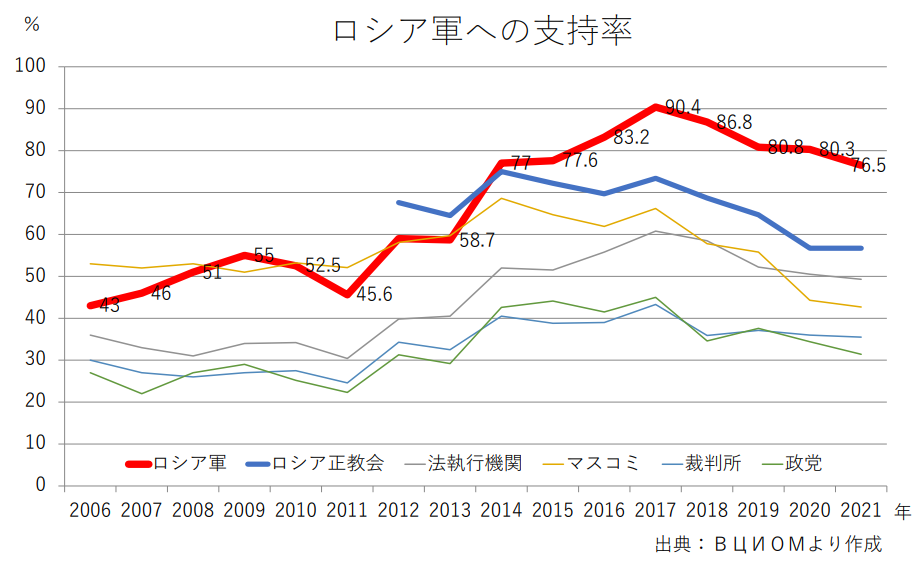 全ロシア世論調査センター(ВЦИОМ)のデータ(右図)によると、ロシア軍に対する支持率は、2014年に、前年の58.7%から77.0%へと急上昇して以降、2017年には90%を超えるなど、次点のロシア正教会を上回る高い値を維持している11。2014年を境とする支持率の上昇は、クリミア併合後の大統領支持率の上昇と呼応するものである一方、2018年の年金受給年齢の引き上げを契機とする大規模な抗議行動以降、大統領支持率が60%台で推移しているのとは対照的に、軍への支持率は高い値を獲得し続けている。