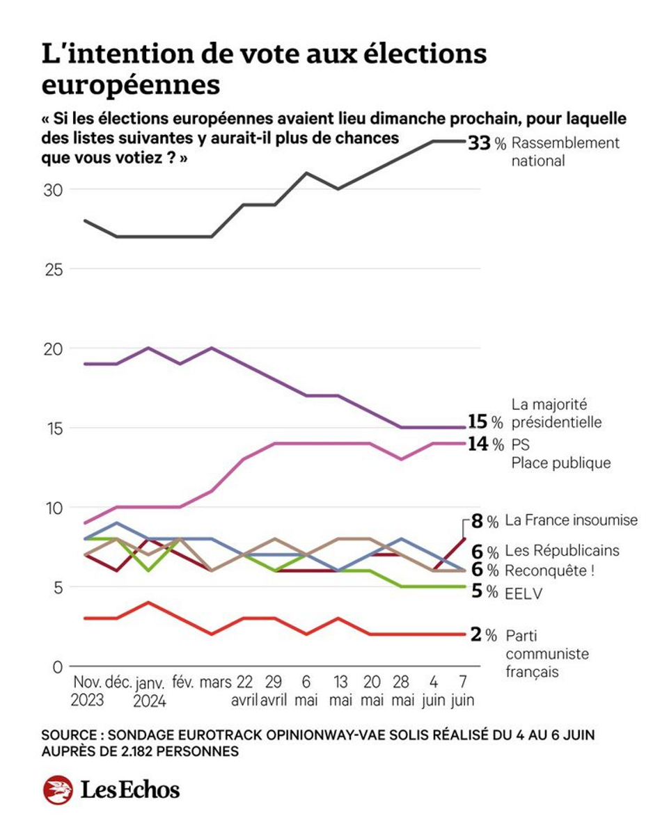 図②選挙戦期間中における党派別支持の推移(出典:Les Echos紙2024年6月7日号より5)