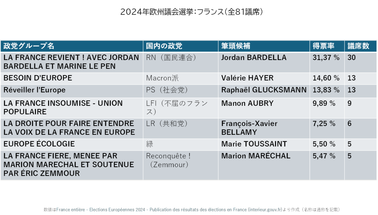 2 〈https://www.archives-resultats-elections.interieur.gouv.fr/resultats/europeennes2024/ensemble_geographique/index.php〉(以下すべて最終閲覧日2024年7月31日)