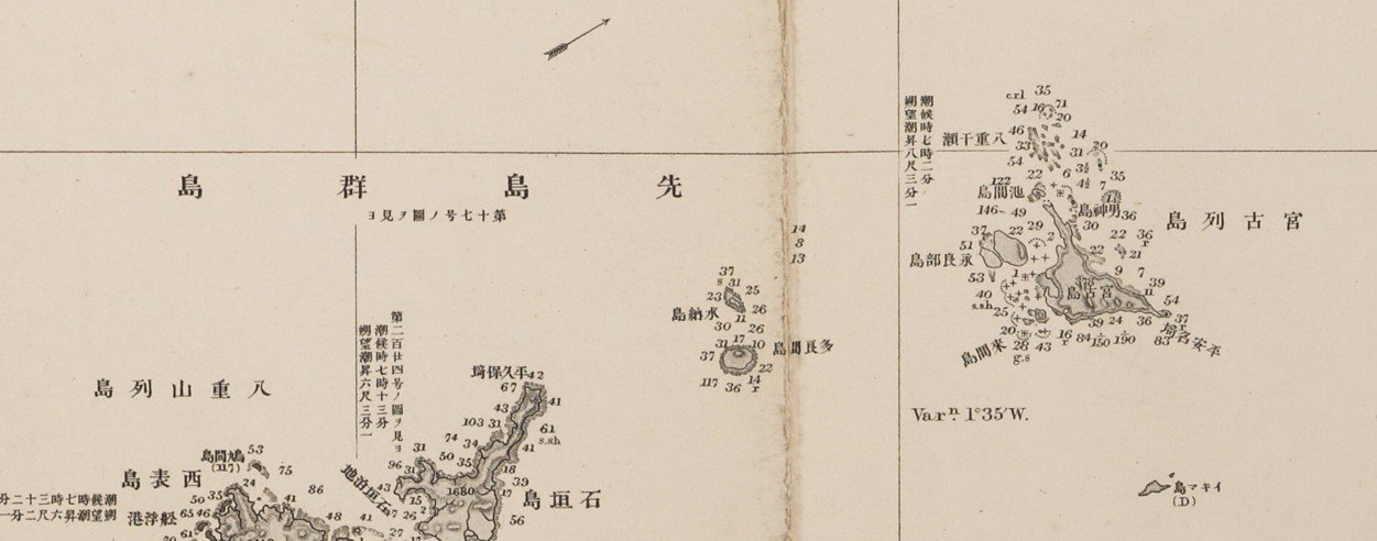 ・上は、日本水路部が1888(明治21)年に刊行した英国海図2412号の覆版、海軍海図第210号『自鹿児島海湾至台湾』(1891年改訂版)1。「先島群島」「八重山列島」「宮古列島」など、もととなる英国海図にはない日本側の名称を書き入れている。