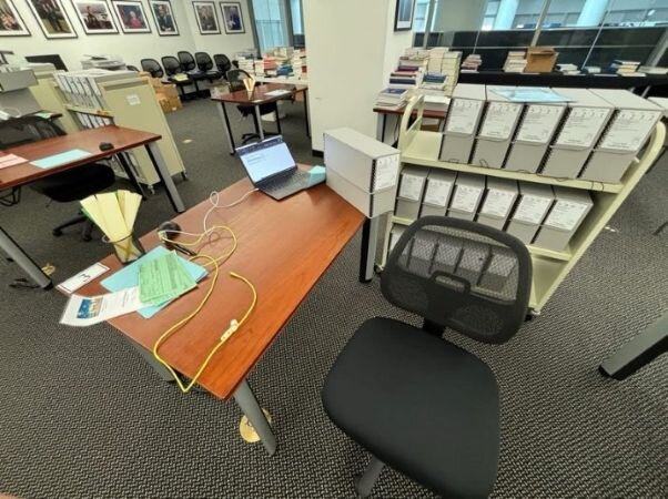 その日初めて入室する際は必ず日付、入室時間、名前を所定の用紙に記入してから、割り当てられた席にて作業を開始することになる。アーキビストは常時いるため、いつでも相談にのってもらえる。筆者の場合、事前に閲覧したい文書群のリストをメールにて送付していたので、アーキビストが事前に請求用紙(Slip)への記入と資料Boxの引き出しを済ましておいてくれた。資料カートは1台分を閲覧し終えるごとに交換する。なお閲覧時のルールについては上記のオンライン・オリエンテーションで学ぶことになるので、ここでは省略する(国立公文書館やその他の大統領図書館と基本的には同じ)。鉛筆、パソコン、スマートフォン、デジタルカメラ、三脚は持ち込み可能である(閲覧室にはWi-Fiがある)。そして一日の作業が終われば、アーキビストに現在使用中のカートをそのまま翌日も利用するか、返却して翌朝には新たなカートを用意してもらうかを伝えたうえで、退出時間を所定の用紙に記入し、スタッフ付き添いのもとで図書館の出口まで行くことになる。